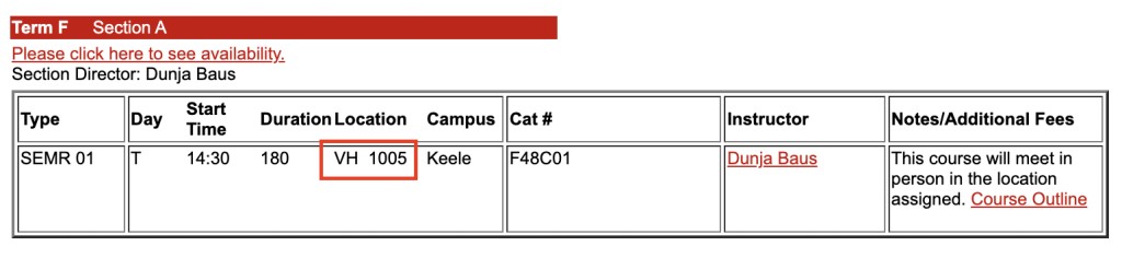 Some of your classes may have location codes assigned to them. The first two letters stand for the building, and the four numbers are the room number. In the photo below, VH stands for Vari Hall, and the class is held in room 1005. It’s helpful to bookmark the building acronyms webpage to reference back to.