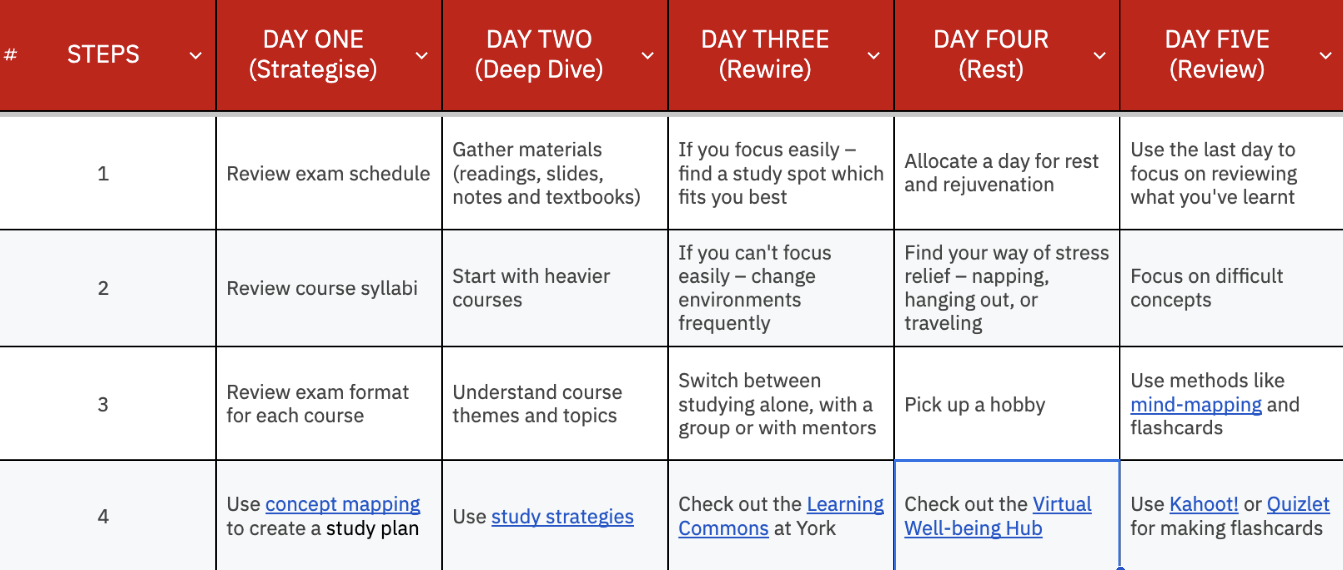 That’s why I’m excited to share the five-day exam prep challenge. A comprehensive, easy-to-follow plan that will help you feel confident and prepared heading into your finals while leaving time for you to take care of yourself – physically and mentally!